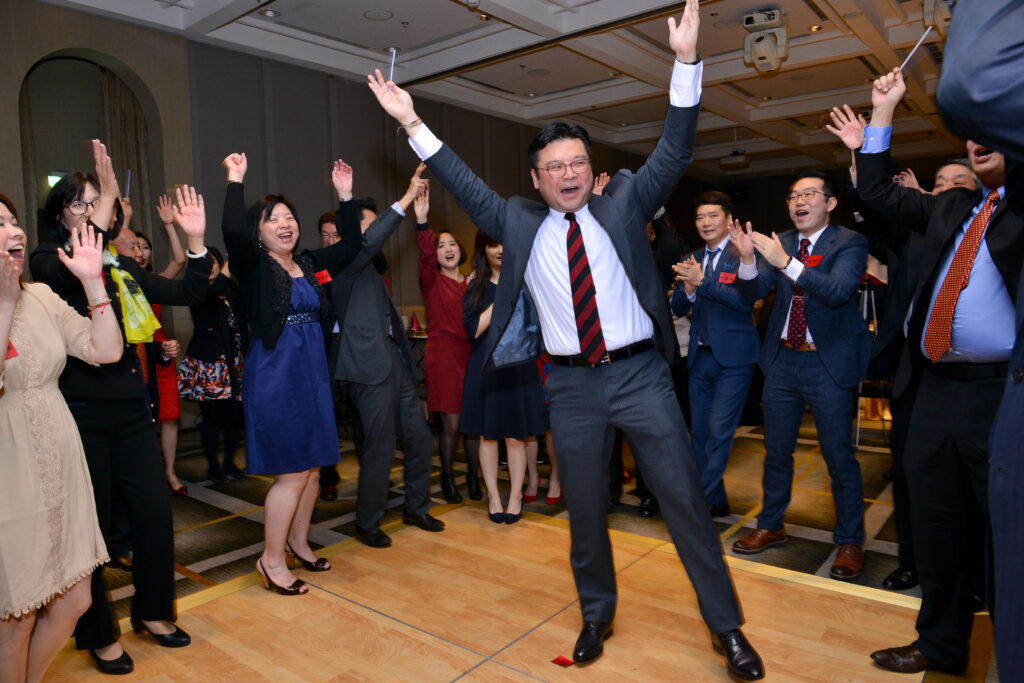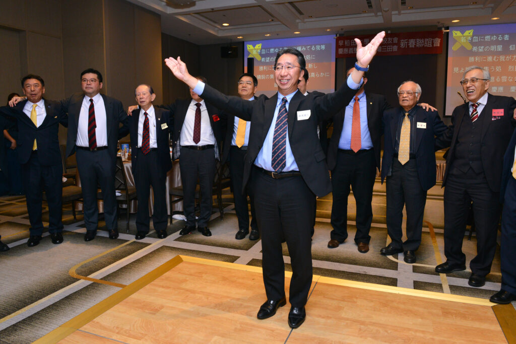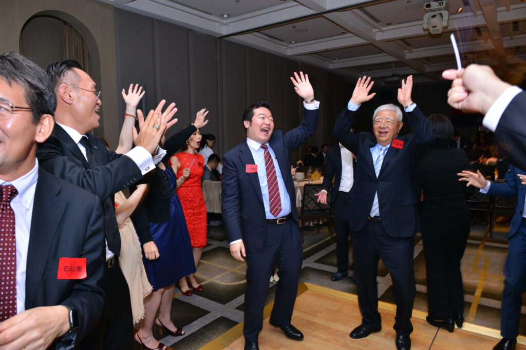 杯光斛影中,大家暢飲由早大校友提供的獺祭清酒,席間流洩著由高雄請來專業的歌手及Live Band現場演唱歌曲,台灣三田會長林華明賢伉儷翩翩起舞,接著許文星前會長夫人也以曼妙的舞姿展現風華。早大林 滄智前會長伉儷也儷影雙雙滑進舞池,甜蜜的舞姿羨煞眾人。早稻田還好有許瓈文校友撐場面,探戈、吉盧巴、恰恰…堪稱是早大最優雅的舞后。為了炒熱氣氛,籌委會一行人卯足力下場熱舞,帶動早慶兩校聯手手足舞蹈,將氣氛炒熱到最高點,充滿年輕的活力也注入嶄新的氛圍。 此外兩校的校友提供了電視及手機等高級的抽獎獎項,非常幸運地第一特獎「55吋液晶電視」由早大校友抽到。最後由台北稻門會的大橋會長帶大家舉杯慶賀,並且請台北稻門會的松原先生帶動唱校歌,完成這一場讓老中青校友活力十足的早慶新春聯誼會。